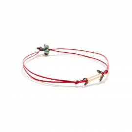 Arrow bracelet in 18k rose gold with rubies totaling 0.05ct on grey cord.