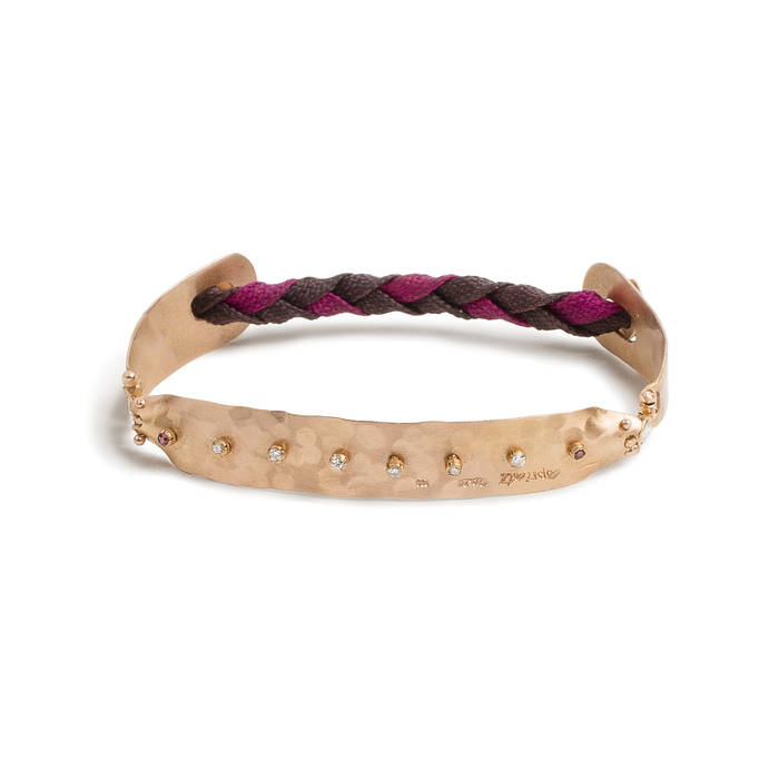 Bracelet in 18k gold hand hammered with fine make brilliant-cut diamonds 0.32ct and rubies 0.04ct with braided cord.