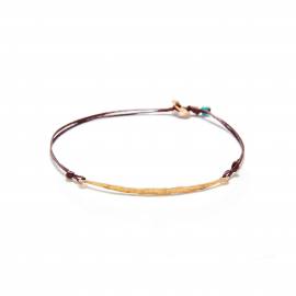 Arrow bracelet in 18k rose gold with rubies totaling 0.05ct on grey cord.